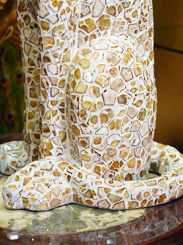This ceramic Mosaic Animal Sculpture is a masterpiece, perfectly blending handcrafted ceramic tiles with a resin base to create an elegant and sophisticated design. Each ceramic tile is meticulously hand-laid by skilled artisans, ensuring that every sculpture is unique. The intricate mosaic patterns and vibrant colors give the sculpture a distinctive texture, making it a striking focal point in high-end commercial spaces and luxury residences.