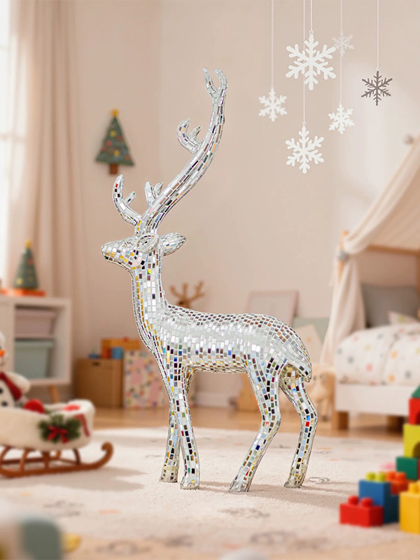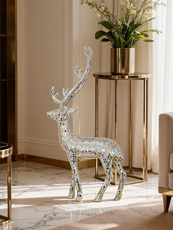 Durch die Verwendung hochwertiger Materialien, exquisiter Handwerkskunst und feiner Mosaik-Collage-Technologie entsteht ein lebensechtes Bild eines Hirsches. Der Hauptteil der Hirschskulptur besteht aus Verbundwerkstoffen und kombiniert einen leichten Metallrahmen mit hochwetterbeständigen Materialien. Durch den geschickten Einsatz der Mosaik-Collage-Technologie besteht jedes Hirschkörperteil aus kleinen Stücken bunter Mosaikfliesen, um wunderschöne Muster und Texturen zu bilden. Das Produkt kann je nach Kundenwunsch individuell angepasst werden, einschließlich Größe, Farbe und Materialauswahl.