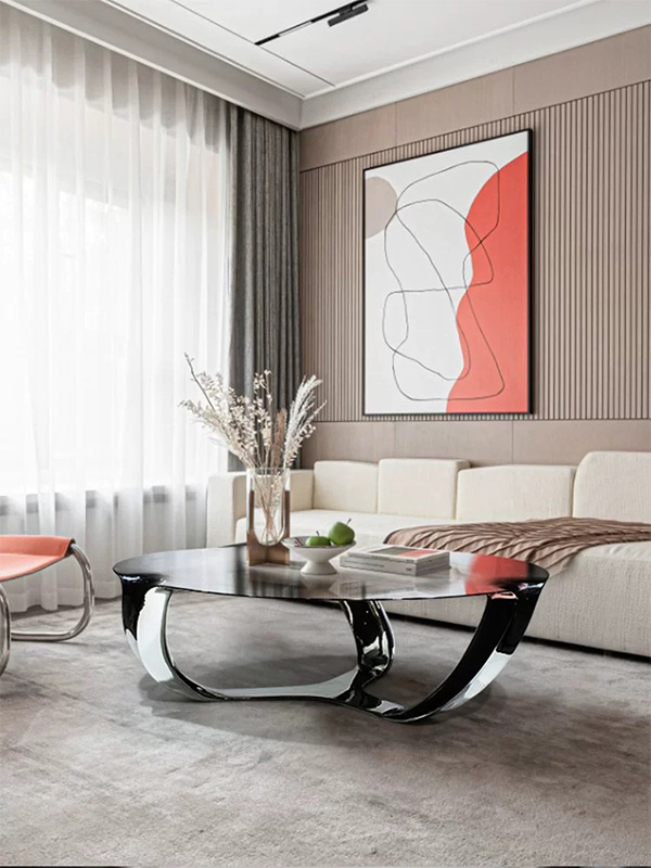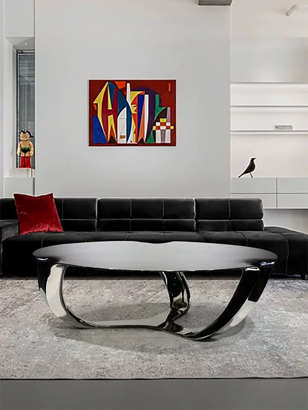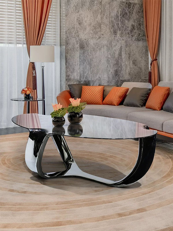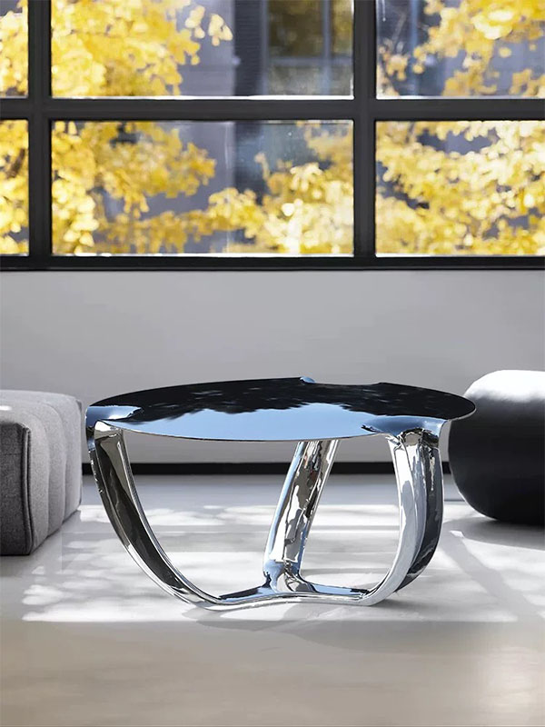 Der Couchtisch mit Hocker und Möbeln aus Edelstahl ist eine einzigartige und exquisite Inneneinrichtung. Die Oberfläche besteht aus Edelstahl 312 und ist fein poliert, um einen glänzenden Spiegeleffekt zu erzielen. Der Hocker und der Couchtisch sind schlicht und modern im Design, mit glatten Linien und zeugen von Sinn für Mode und Luxus. Der reflektierende Effekt des Polierens auf a Spiegelskulptur Die Oberfläche verleiht dem Raum Helligkeit und spiegelt die Umgebung wider. Diese maßgefertigten Möbel sind sowohl funktional als auch dekorativ und verleihen jedem Wohnraum einen einzigartigen Charme und Eleganz. Ob Wohnzimmer, Lounge oder Büro, es kann zum Blickfang werden.